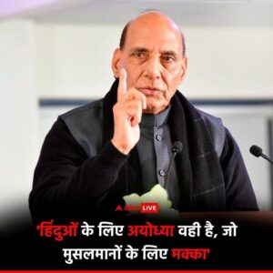 केंद्रीय रक्षा मंत्री राजनाथ सिंह ने कहा कि अयोध्या नगरी को अंतत: वह सम्मान मिल गया है जिसकी वह हकदार थी और जो उसे आजादी के तुरंत बाद मिलना चाहिए था. बीजेपी) के नेता बलबीर पुंज की पुस्तक ‘ट्रिस्ट विद अयोध्या’ के विमोचन के अवसर पर रक्षा मंत्री सिंह ने कहा कि हिंदुओं के लिए अयोध्या वही है जो मुसलमानों के लिए मक्का है और ईसाइयों के लिए यरूशलम है. उन्होंने कहा कि वे चंद लोग हाशिए पर चले गए हैं जो भगवान राम के अस्तित्व पर सवाल उठाते थे. राम के बिना भारत की कल्पना नहीं की जा सकती.