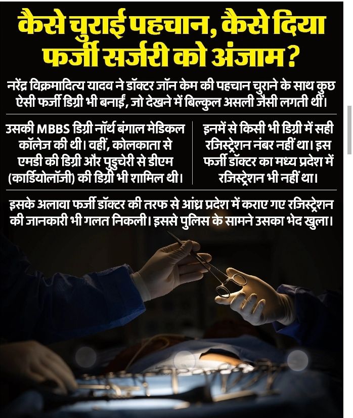इस फर्जी डॉक्टर की अब जो पहचान सामने आई है, उसके मुताबिक, इसका नाम नरेंद्र विक्रमादित्य यादव है, जिसने जॉन कैम की पहचान चोरी कर ली और खुद को लंदन में प्रशिक्षित डॉक्टर बताकर अस्पताल में नियुक्ति तक पा गया। रिपोर्ट्स के मुताबिक, इस फर्जी डॉक्टर ने दिसंबर 2024 को अस्पताल में फर्जी दस्तावेजों के जरिए नियुक्ति पाई। इस दौरान अस्पताल ने उसे ठीक से जांच किए बिना आठ लाख रुपये प्रतिमाह वेतन देने का कॉन्ट्रैक्ट भी किया। इसके बाद अस्पताल में मरीजों की जिंदगी के साथ खिलवाड़ शुरू हुआ।