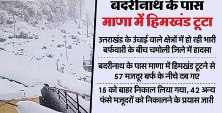 उत्तराखंड के ऊंचाई वाले इलाकों में बर्फबारी के बीच शुक्रवार को भारत-चीन (तिब्बत) सीमा क्षेत्र में माणा कैंप के पास भारी हिमस्खलन हुआ है। इस दौरान वहां निर्माण कार्य में लगे 57 मजदूर बर्फ में दब गए। आईजी गढ़वाल राजीव स्वरूप ने बताया कि अब तक 15 मजदूरों को निकाल लिया गया है। अन्य की तलाश जारी है।