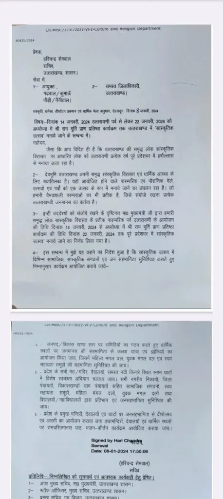 विषयः-दिनांक 14 जनवरी, 2024 उत्तरायणी पर्व से लेकर 22 जनवरी, 2024 को अध्योध्या में श्री राम मूर्ति प्राण प्रतिष्ठा कार्यकम तक उत्तराखण्ड में ‘सांस्कृतिक उत्सव मनाये जाने के सम्बन्ध में। महोदय