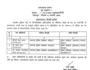 उत्तराखंड : भारतीय पुलिस सेवा के निम्नलिखित अधिकारियों को सीनियर स्केल के पद पर पदोन्नति के फलस्वरूप, उनके नाम के सम्मुख अंकित स्तम्भ – 3 में उल्लिखित पद से, स्तम्भ-4 में अंकित पद पर