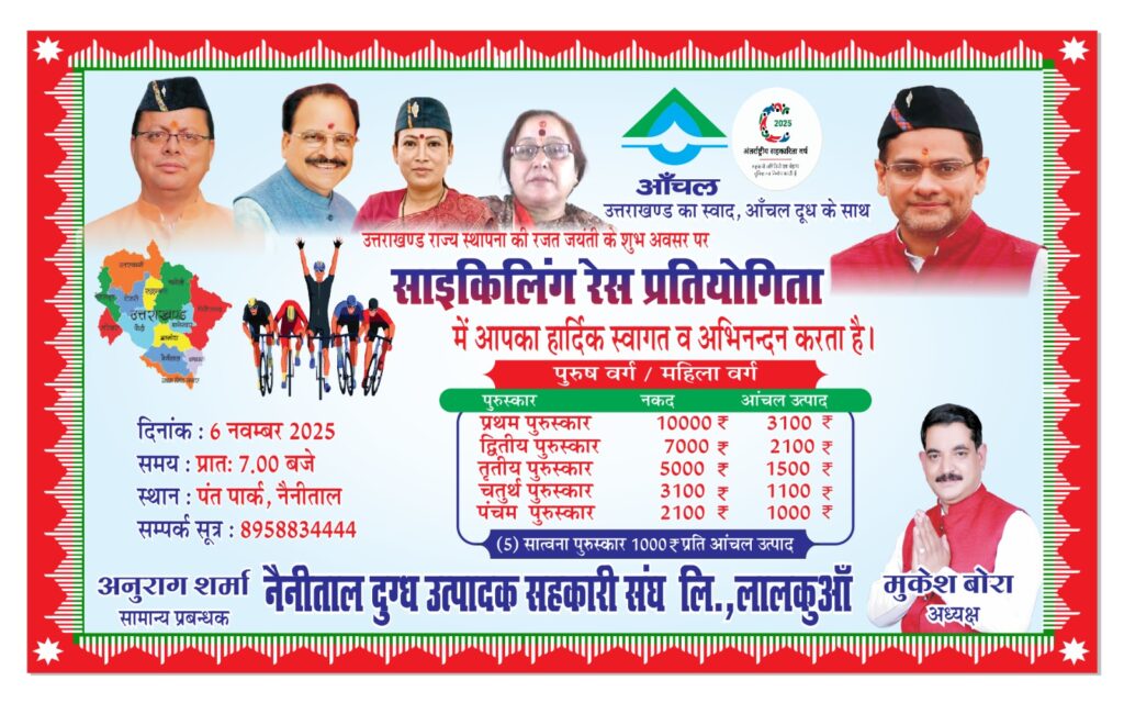 नैनीताल। नैनीताल दुग्ध उत्पादक सहकारी संघ लिमिटेड, लालकुआं द्वारा स्थापना दिवस रजत जयंती समारोह के तहत आयोजित “आँचल उत्तराखण्ड का स्वाद, आँचल दूध के साथ” थीम पर साइकिल रेस में प्रतिभागियों ने उत्साहपूर्वक भाग लिया।