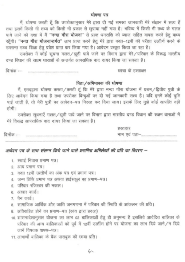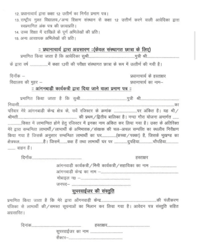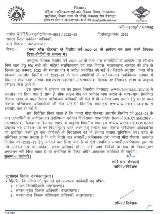 इसलिए आवेदन पत्र का प्रारूप नंदा गौरा योजना के अंतर्गत वित्तीय वर्ष 2022 23 के पात्र लाभार्थियों के आवेदन पत्र समस्त बाल विकास परियोजना अधिकारियों को आदेशित करते हुए कृत कार्यवाही निदेशालय को भी अवगत कराना सुनिश्चित करेंगे नंदा गौरा योजना के अंतर्गत वित्तीय वर्ष 2022 हेतु आवेदन यदि किसी पात्र लाभार्थी द्वारा कर दिया गया है तो ऐसे संबंधी लाभार्थी द्वारा भी नए आवेदन पत्र पर आवेदन करना अनिवार्य है।