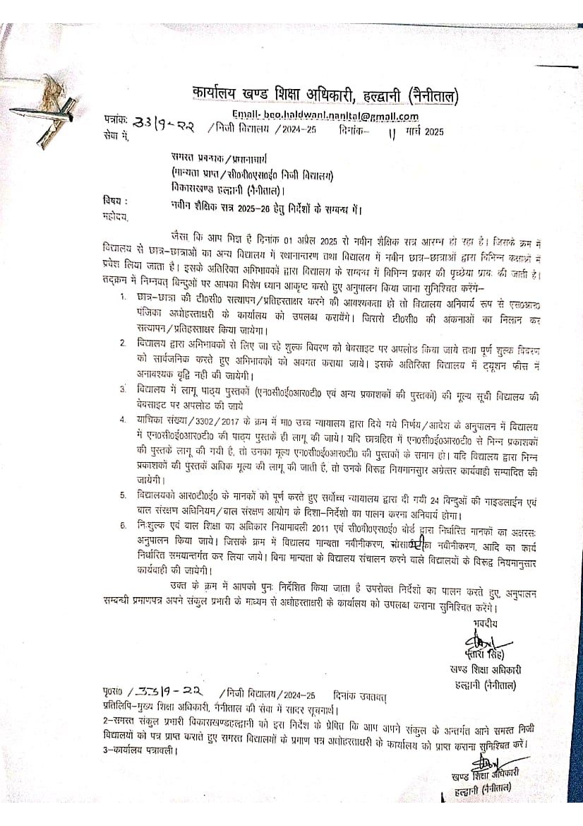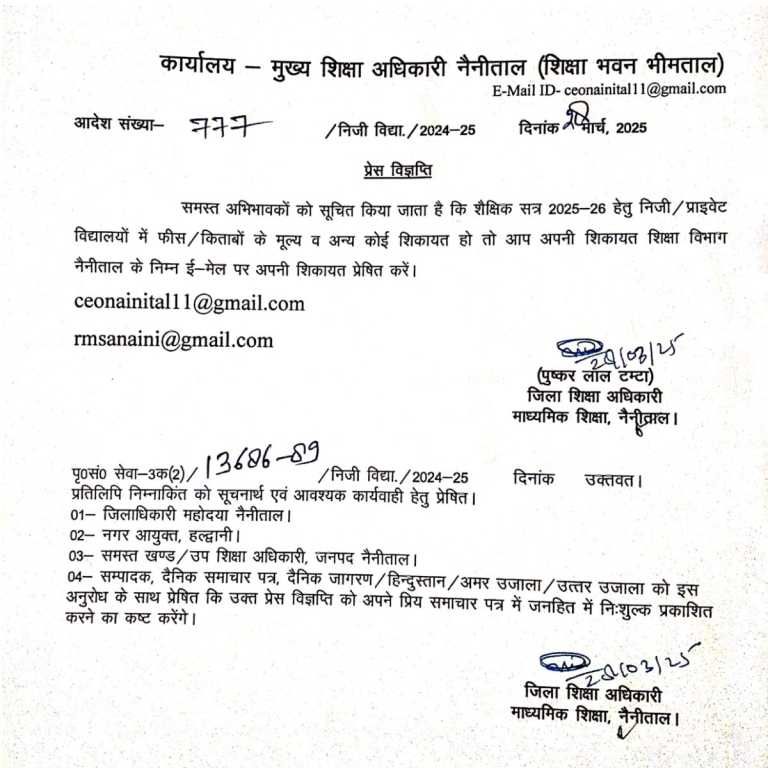 मुख्य शिक्षा अधिकारी, नैनीताल ने आज ही एक प्रेस विज्ञप्ति जारी की, जिसमें सभी अभिभावकों को सूचित किया गया कि शैक्षिक सत्र 2025-26 के दौरान यदि किसी भी निजी विद्यालय में फीस, पुस्तक मूल्य या अन्य किसी भी प्रकार की शिकायत दर्ज की जाती है, तो वे अपनी शिकायत संबंधित ई-मेल आईडी (ceonainital11@gmail.com एवं rmsanaini@gmail.com) पर दर्ज कर सकते हैं।