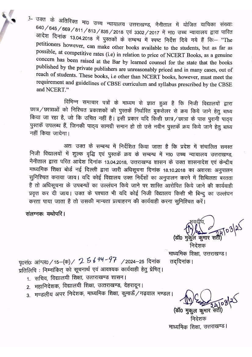 उच्च न्यायालय के आदेश (याचिका संख्या/3302/2017, दिनांक 13 अप्रैल 2018) के अनुरूप, विद्यालयों में केवल एनसीईआरटी की पाठ्य पुस्तकों का प्रयोग किया जाना चाहिए। यदि किसी छात्र हित में अन्य प्रकाशकों की पुस्तकें अपनाई जाती हैं, तो उनका मूल्य एनसीईआरटी पुस्तकों के समकक्ष होना अनिवार्य होगा। किसी भी उल्लंघन की स्थिति में नियमानुसार अग्रेत्तर कार्रवाई की जाएगी।