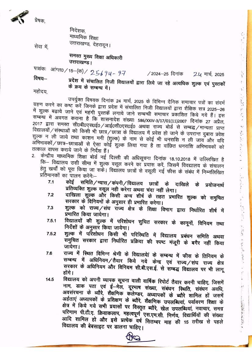 निदेशक, माध्यमिक शिक्षा उत्तराखण्ड (देहरादून) ने एक अन्य विस्तृत नोटिस जारी करते हुए शासनादेश संख्या 586/XXIV-3/17/01 (11) 2007 और केन्द्रीय माध्यमिक शिक्षा बोर्ड नई दिल्ली की अधिसूचना दिनांक 18.10.2018 का हवाला देते हुए निर्देश जारी किए हैं। इसमें स्पष्ट किया गया कि किसी भी छात्र के प्रवेश के बाद पुनः प्रवेश शुल्क या काशन मनी के नाम पर कोई अतिरिक्त राशि नहीं ली जानी चाहिए, और यदि ऐसा किया गया तो तुरंत अभिभावकों को वापस कराना होगा। साथ ही, विद्यालयों को अपनी वार्षिक रिपोर्ट में अध्यापकों की योग्यता, शैक्षणिक उपलब्धियां, पर्यावरण शिक्षा के प्रयासों एवं अन्य प्रासंगिक जानकारी को 15 सितम्बर तक वेबसाइट पर प्रकाशित करना अनिवार्य किया गया है।