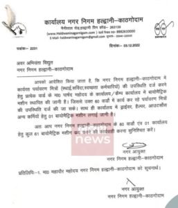 नगर आयुक्त हल्द्वानी- काठगोदाम ने अवर अभियंता को निर्देश दिये हैं, कि नगर निगम हल्द्वानी-काठगोदाम में कार्यरत पर्यावरण मित्रों (स्थाई, सविंदा, स्वच्छता कर्मचारियों) की उपस्थिति दर्ज करने हेतु प्रत्येक वार्ड के मा० पार्षद महोदय के कार्यालय / कैम्प कार्यालय में बायोमैट्रिक मशीन स्थापित की जानी है। जिससे उक्त 60 वार्डो में कार्य कर रहे पर्यावरण मित्रों की उपस्थिति दर्ज की जा सके। साथ ही कार्यालय में ड्राईवर, हैल्पर, आउटर्सोस अन्य कर्मियों हेतु 01 बायोमैट्रिक मशीन लगाई जानी है।