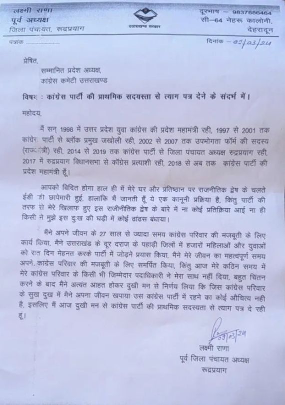 रुद्रप्रयाग से कांग्रेस की टिकट पर चुनाव लड़ चुकी पूर्व जिला पंचायत अध्यक्ष और हरक सिंह रावत के करीबी लक्ष्मी राणा ने भी कांग्रेस से अलविदा कह दिया,