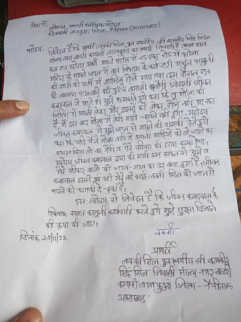लक्की गिल के खिलाफ दी गाली गलौज एंव जान से मारने कि धमकी देने कि तहरीर”वही ट्रासपोर्टर लक्की गिल ने भी दी वरिष्ठ ट्रासपोर्टर जीवन कबडवाल के खिलाफ तहरीर।