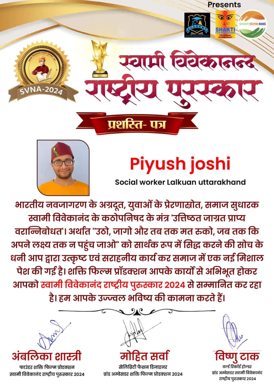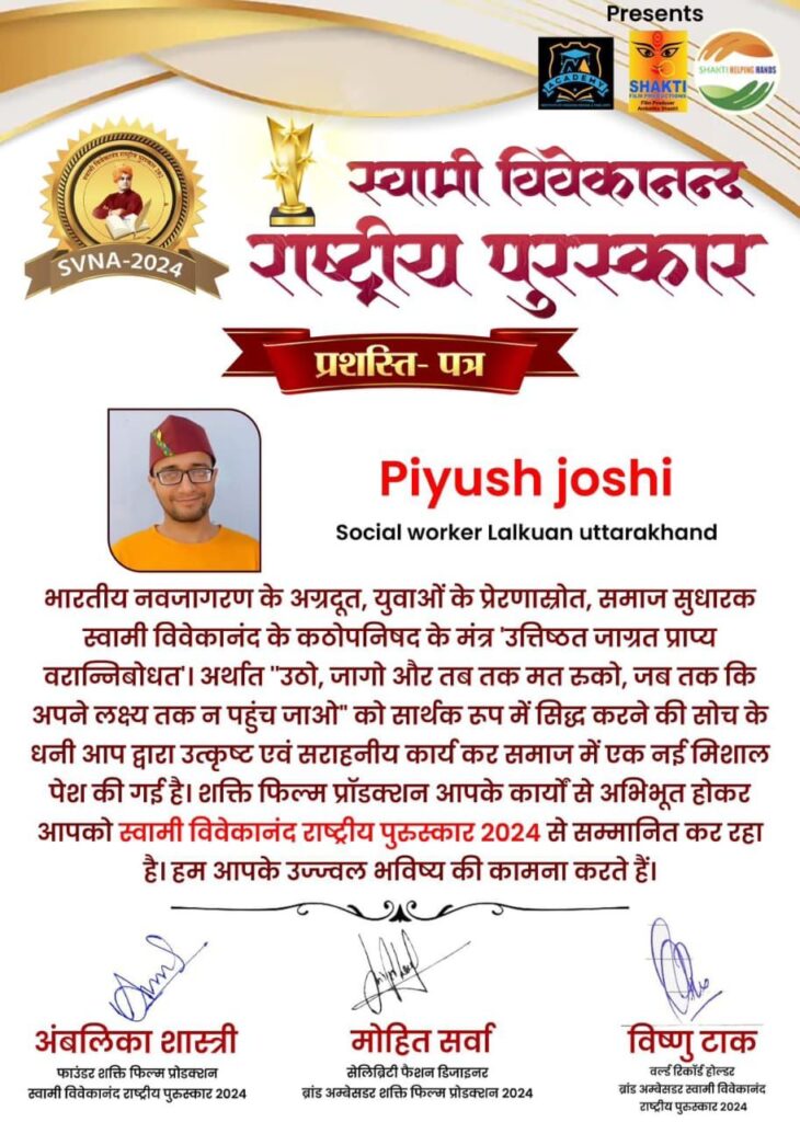 जिसमे उत्तराखंड में युवाओं के हितों की लड़ाई लड़ने व उत्तराखंड के युवाओं को स्वामी विवेकानंद की तरह जगाने का कार्य कर रहे पीयूष जोशी को “स्वामी विवेकानंद राष्ट्रीय पुरस्कार 2024” से सम्मानित किया गया ।