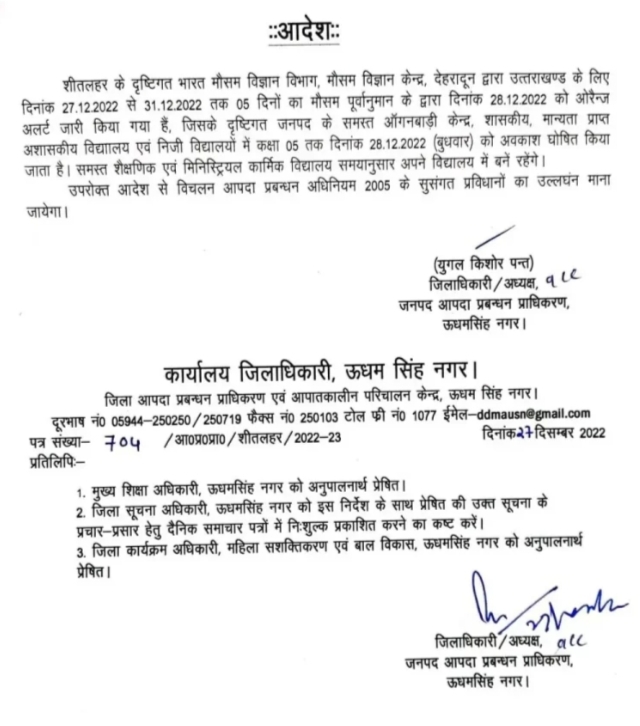 उधम सिंह नगर से बड़ी खबर है कि मौसम विभाग के द्वारा 27 दिसंबर से 31 दिसंबर तक ऑरेंज अलर्ट जारी करने के बाद ऊधम सिंह नगर जिले के जिलाधिकारी डॉ युगल किशोर पंत के द्वारा सरकारी, गैर सरकारी, आंगनवाड़ी केंद्रों कक्षा 5 तक के बच्चों के लिए 28 दिसम्बर बुधवार को अवकाश घोषित किया है।